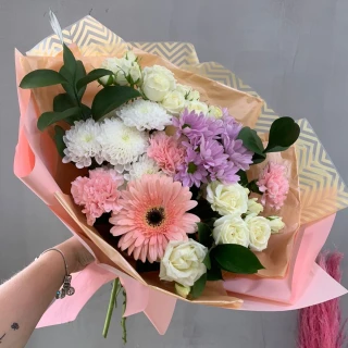 Этот нежный букет из ярких гербер, роз и хризантем словно прикосновение бархатных лепестков. Великолепное сочетание цветов создает яркое и радостное настроение. Оригинальная упаковка дарит ощущение загадочности и сказочности. Это букет, способный пробудить самые теплые чувства и дарить благосклонность. Он станет настоящим волшебным прикосновением для вашего получателя.